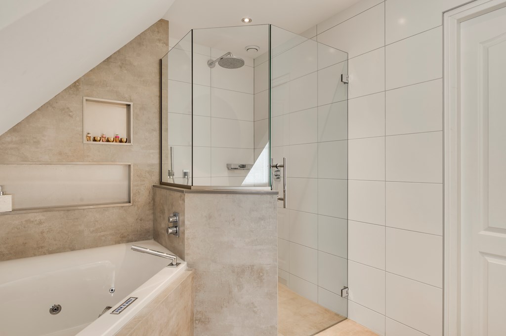 De eerste verdieping heeft 3 ruime slaapkamers met dakkapel, een fraaie badkamer (ook met dakkapel) waarin badkamermeubel met dubbele wastafel, wandcloset, whirlpool en een douchecabine met glazen wanden.