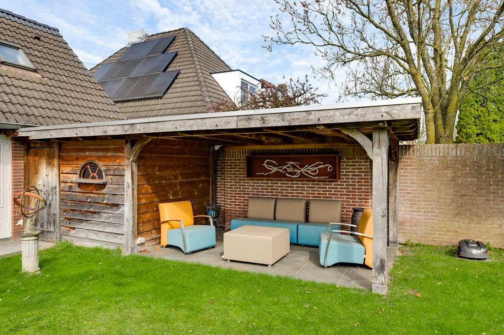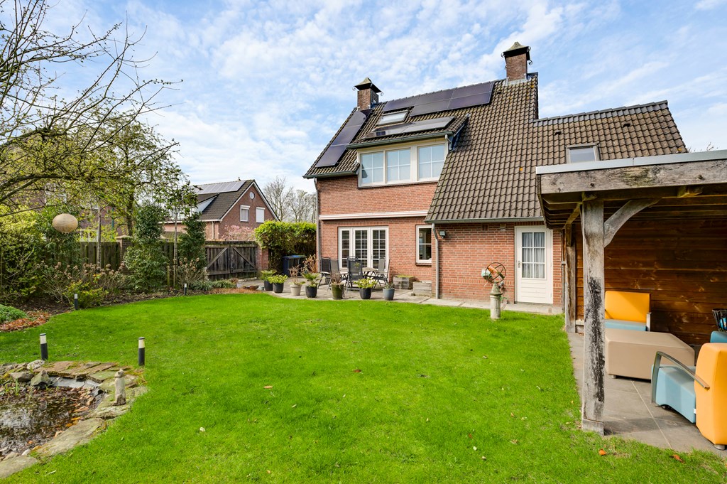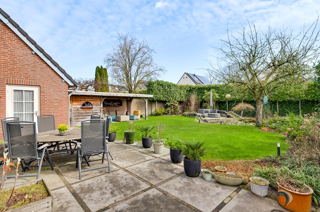 De achtertuin is een echte eyecatcher: royaal van opzet, mooi aangelegd, zonnig (op het zuidoosten) met een groot zonnescherm. De tuin beschikt over een sfeervolle overkapping, een vijverpartij, meerdere terrassen waaronder een bij de vijver en een terras aan het huis en een houten berging. De tuin is volledig omheind en beschikt over een dubbele openslaande zijpoort. De tuin heeft tuinverlichting, een sproei installatie en een maairobot. Ook de voortuin is mooi aangelegd, heeft sfeervolle verlichting en een sproei installatie.