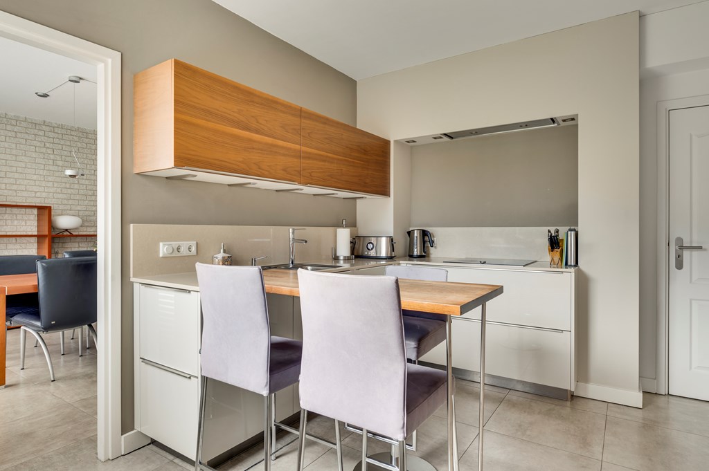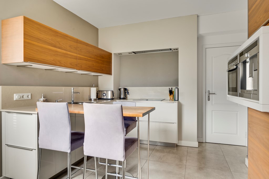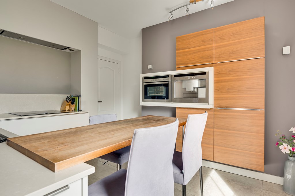 De dichte keuken is, rondom de centrale bar, voorzien van Neff apparatuur zoals inductiekookplaat, stoomoven, koffieautomaat, koelkast en vaatwasser. Aansluitend aan de keuken is er enerzijds een verdiepte kelderkast en anderzijds een praktische bijkeuken met aansluitingen voor wasapparatuur. Deze bijkeuken zorgt ook voor een overdekte doorgang naar de garage en dient als achteruitgang naar de tuin. Zowel keuken als bijkeuken zijn voorzien van vloerverwarming.