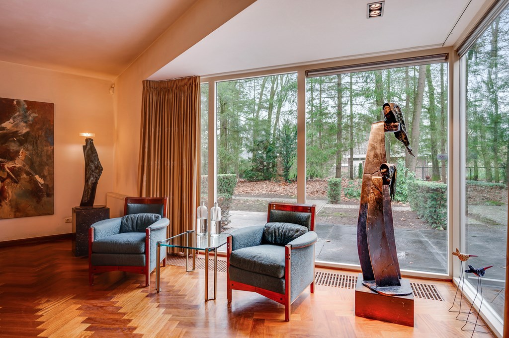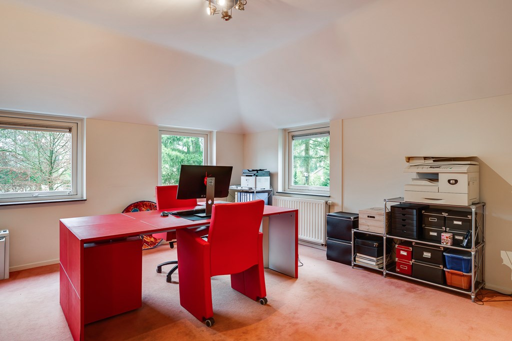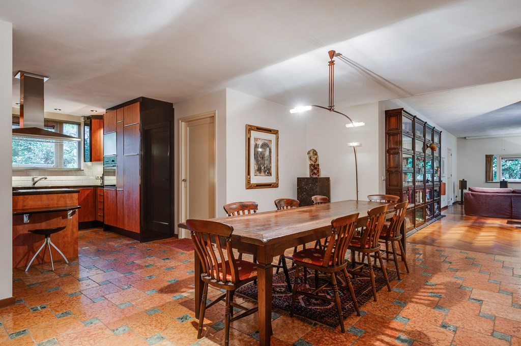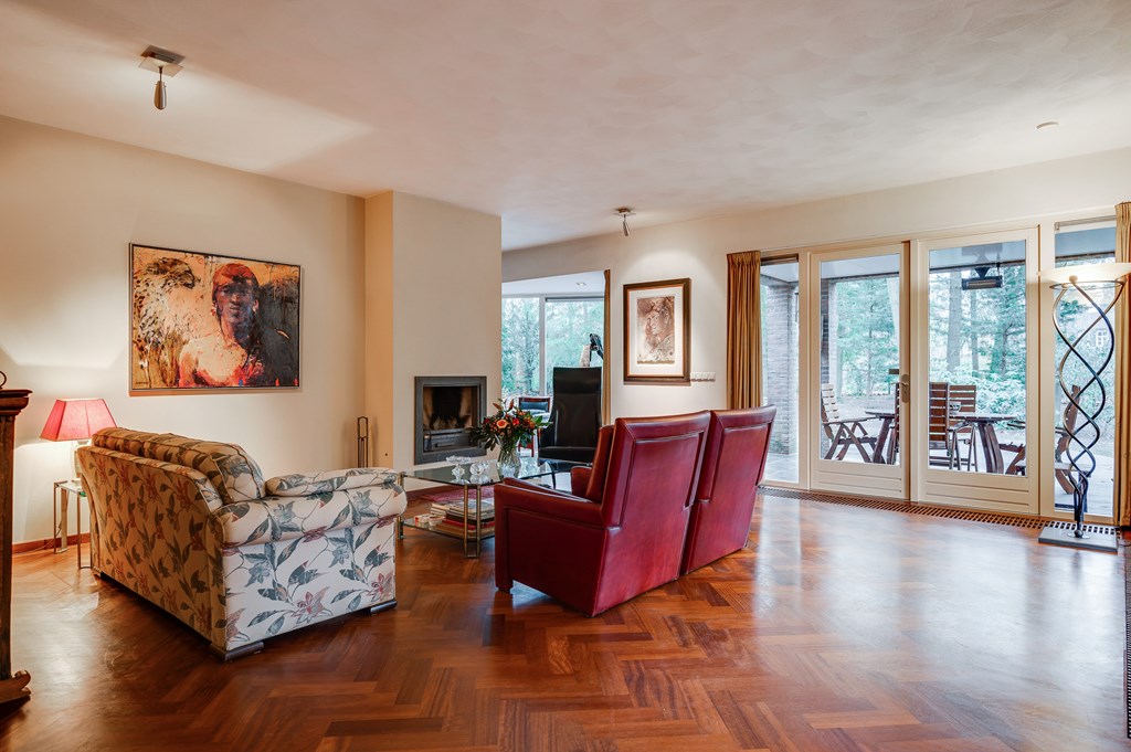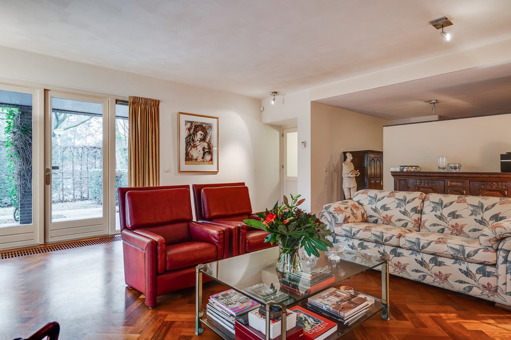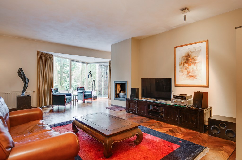 De mega woonkamer is verdeeld in meerdere sfeervolle gedeeltes: een gezellige eetkamer, een knusse zitkamer en een inspirerend muziek- of werkkamerdeel. Dankzij de grote ramen geniet u overal van een prachtig uitzicht op de tuin. De warme houten parketvloer voegt een extra vleugje klasse toe.