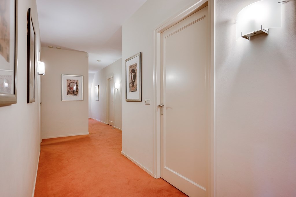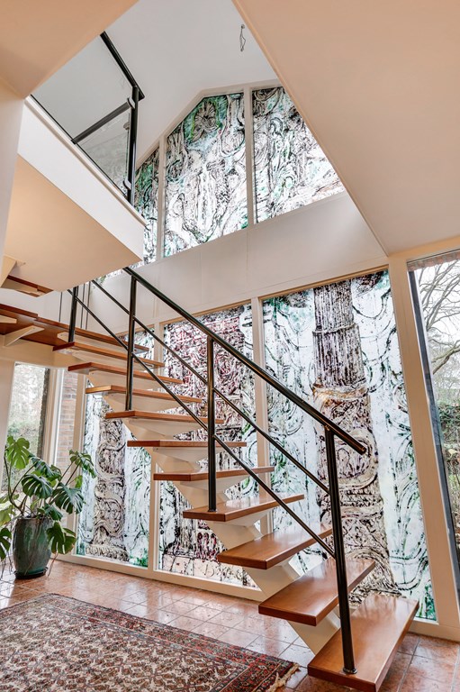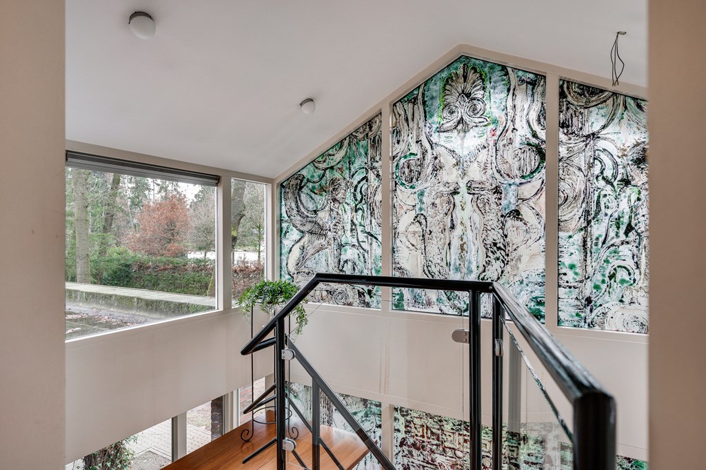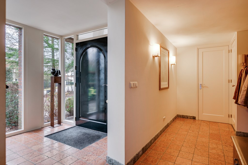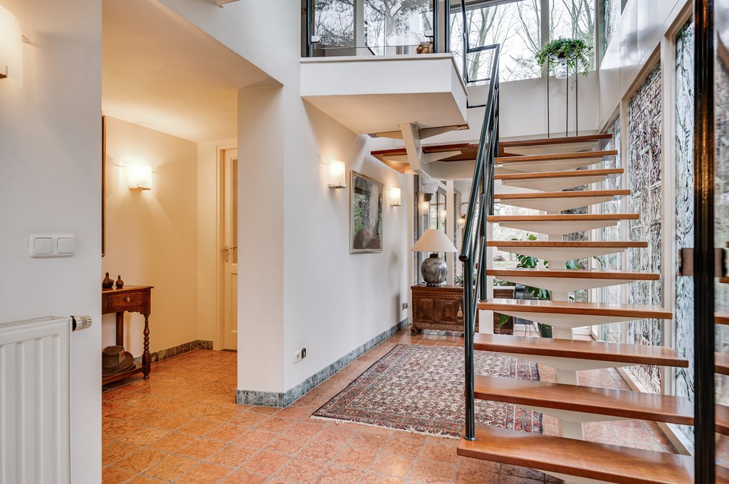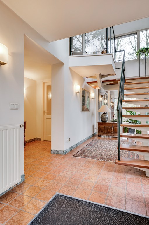 De ruime, hoge hal straalt grandeur uit dankzij de prachtige elementen zoals het gebrandschilderde glas. Een handige garderobenis en een gastentoilet...