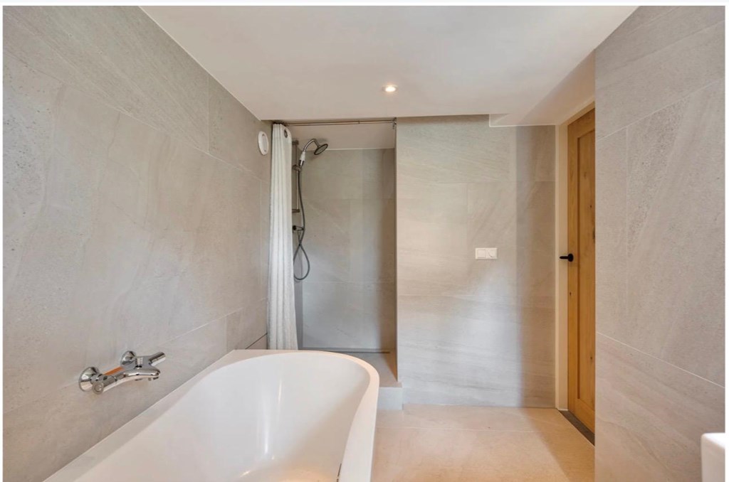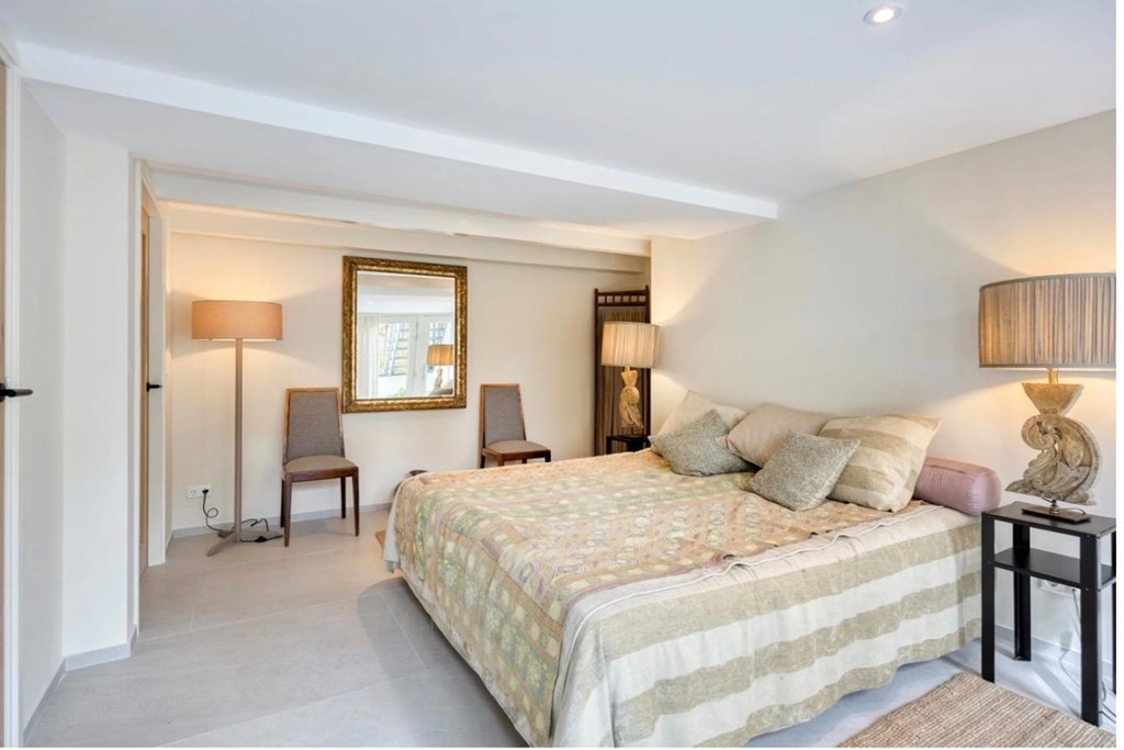 De derde en grootste slaapkamer, de masterbedroom, heeft een luxe en-suite badkamer met ligbad, douche en toilet. Deze hoofdslaapkamer grenst met meerdere openslaande deuren aan een besloten privé patio terras met iets hoger gelegen de prachtige achtertuin.