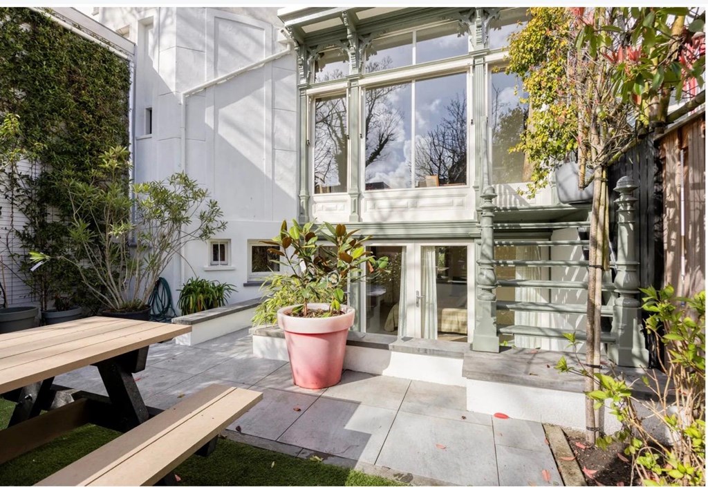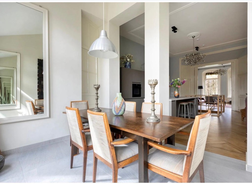 De eetkamer bevindt zich in de aansluitende serre met authentieke elementen, een prachtige Italiaans tegelvloer, en biedt een fraai uitzicht op de achtertuin. Vanuit de serre is middels een houten trap de prachtige, met veel groen ingerichte, achtertuin te bereiken.