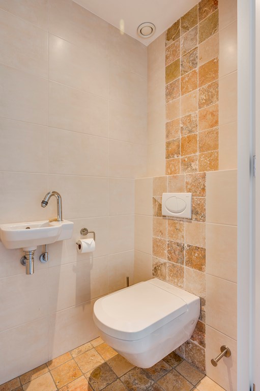 Royale geheel betegelde luxe badkamer voorzien van vloerverwarming, stoom/douchecabine, zwevend toilet, dubbele wastafel, tweetal design radiatoren en inbouwspots.