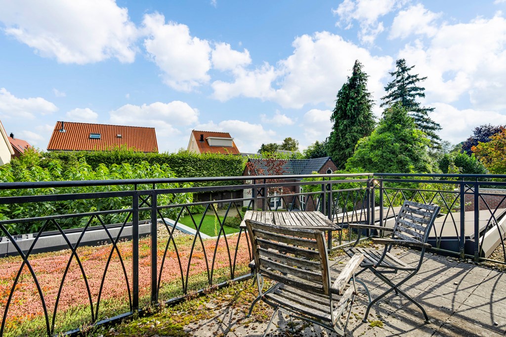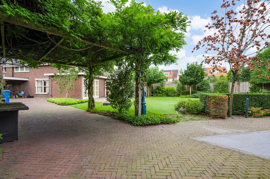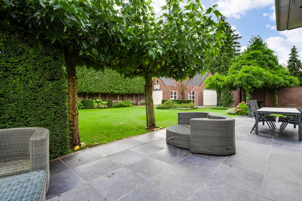 Fraaie rondom aangelegde tuin met optimale privacy, diverse terrassen, groot gazon en voorzien van een robotmaaier, tuinverlichting, beregeninginstallatie, buitendouche, stroompunt ten behoeve van een jacuzzi, carport en een grote oprit met plaats voor 5 auto’s.