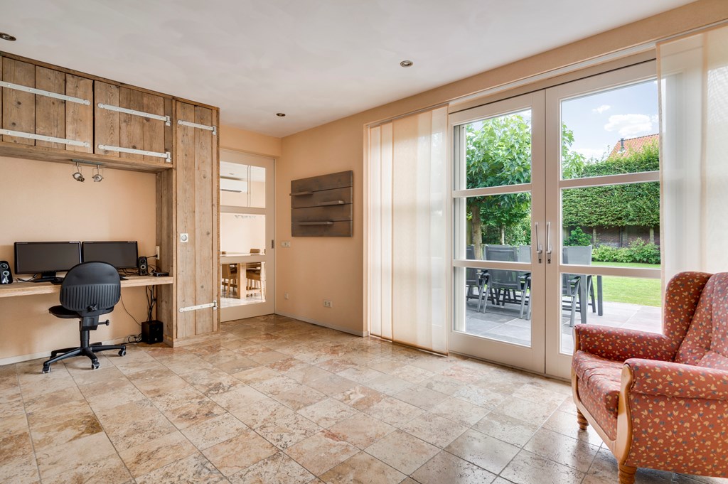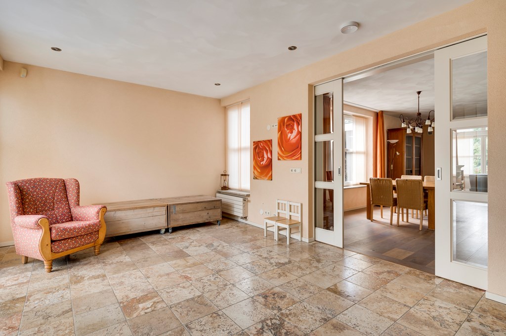Vanuit de living middels schuifdeuren toegang naar de speel/tuinkamer met fraaie getrommelde marmeren vloer, schuifpui naar de tuin voorzien van luifel.