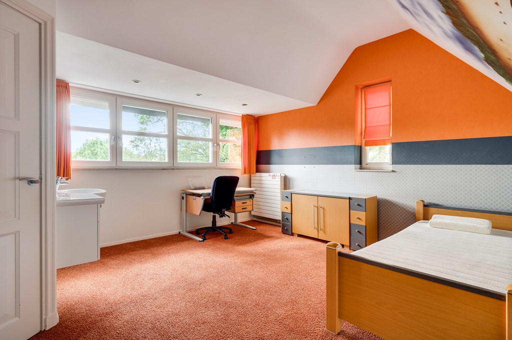 4e Kinderslaapkamer met vloerbedekking en kastenwand.