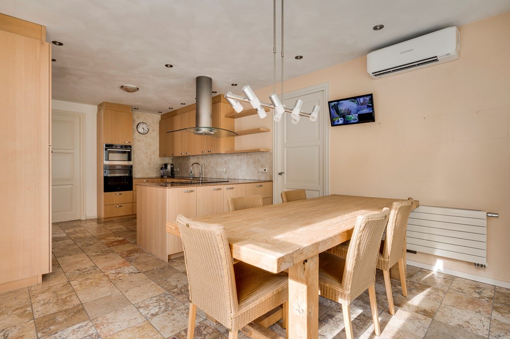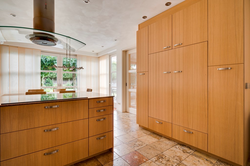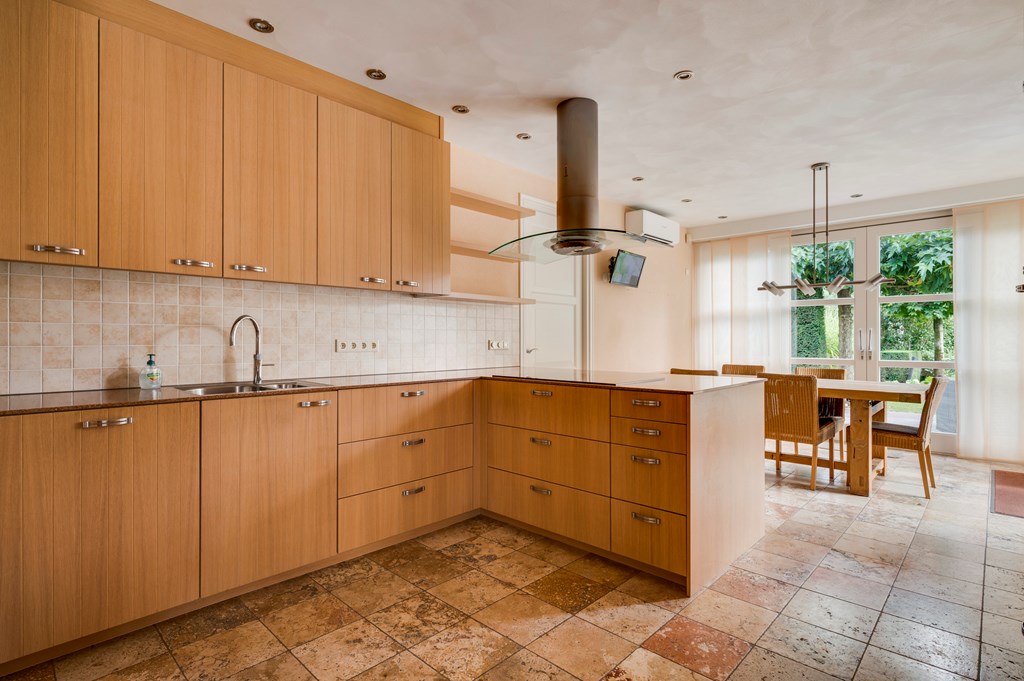 Grote leefkeuken met tijdloze getrommelde marmeren vloer. Luxe kwalitatief hoogwaardige keukenopstelling met granieten aanrechtblad. Compleet met inbouwapparatuur zoals: vaatwasser, koelkast, vriezer, combioven, Combi Cooker, heteluchtoven, 5 pits inductie kookplaat en design afzuigkap. Keuken is mede voorzien van een airconditioning (2022). Zowel een schuifpui als een loopdeur welke toegang bieden naar de achtertuin, voorzien van luifel.