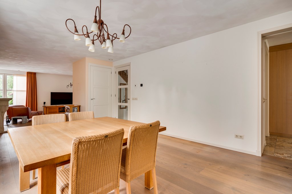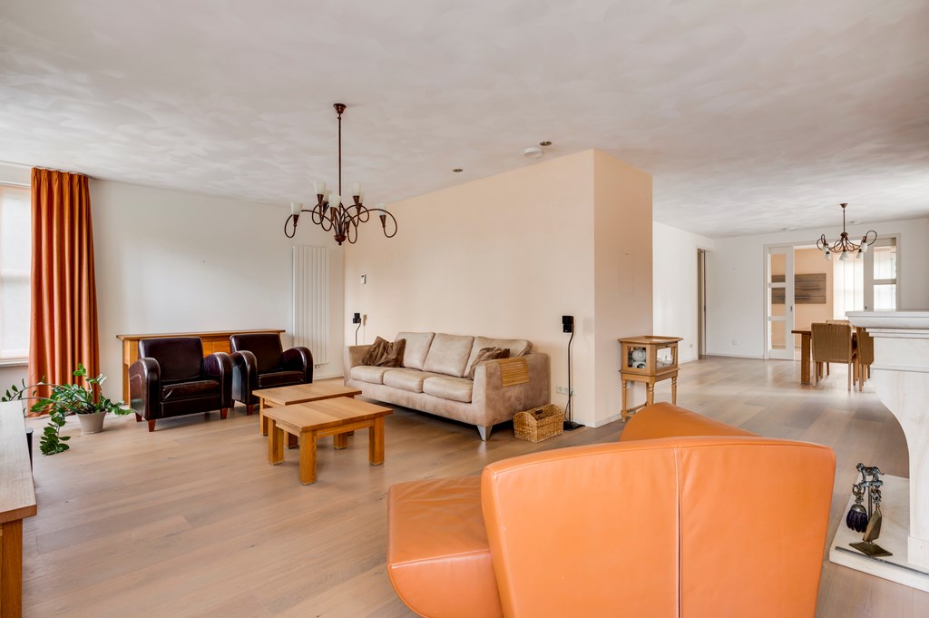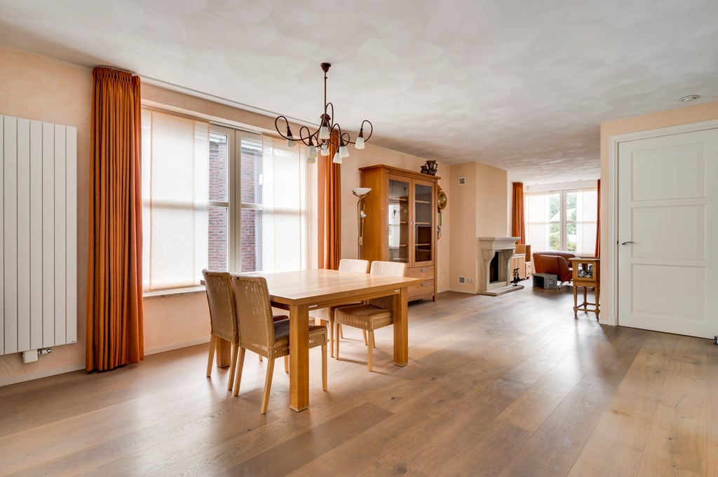 Riante living met schitterende massief eikenhouten vloer voorzien van vloerverwarming, openhaard met glazen schuifdeur en voorzien van een zandstenen sierschouw. Vanuit de living fraai wijds uitzicht over de weilanden.