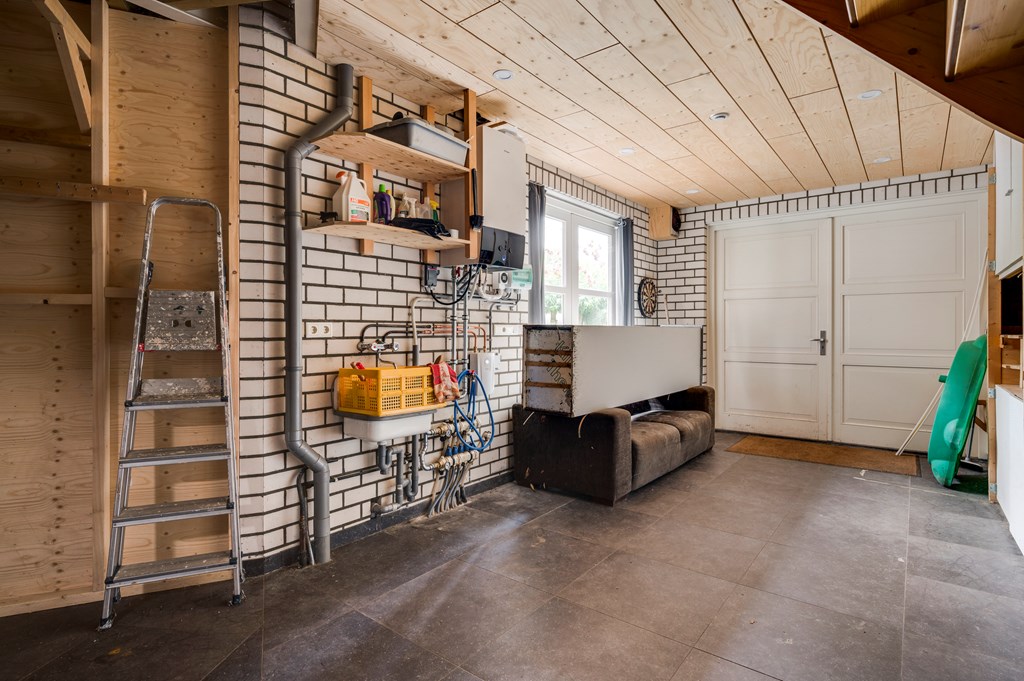 Praktische bijkeuken met stijlvolle getrommelde marmeren vloer, gootsteen, aansluiting ten behoeve van wasapparatuur, inbouwkastenwand met daarin de waterontharder, unit centraal stofzuigsysteem, opstelling van de warmtepomp en warmtepompboiler (2022). Loopdeur naar de oprit.