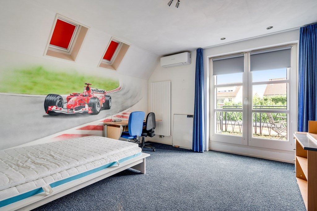 2e Ruime slaapkamer met vloerbedekking, tweetal Velux dakramen met verduistering, vaste wastafel, airconditioning (2022) en openslaande deuren naar dakterras.
