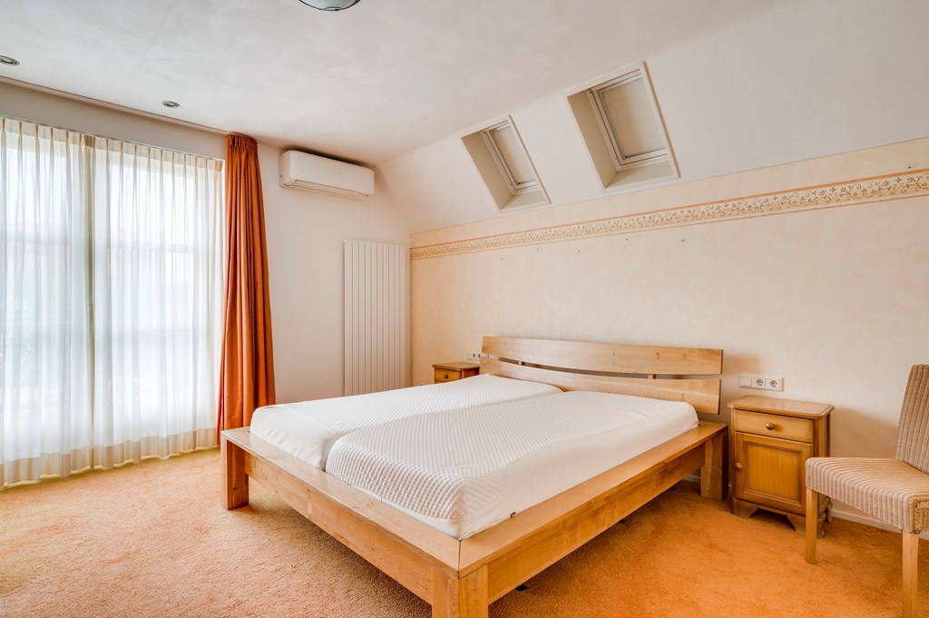 1e Riante ouderslaapkamer met vloerbedekking, tweetal Velux dakramen, airconditioning (2022) en openslaande deuren naar dakterras.