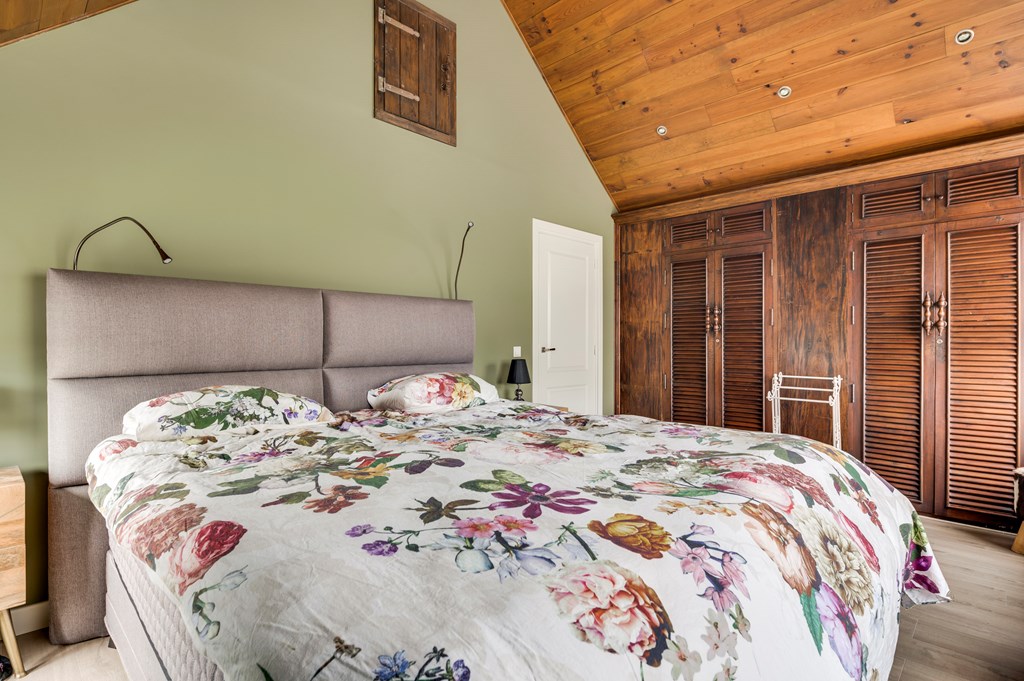 1e Royale slaapkamer met laminaatvloer, maatwerk inbouwkasten, speels hoog plafond tot de nok en luik naar bergzolder.