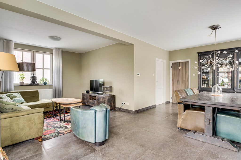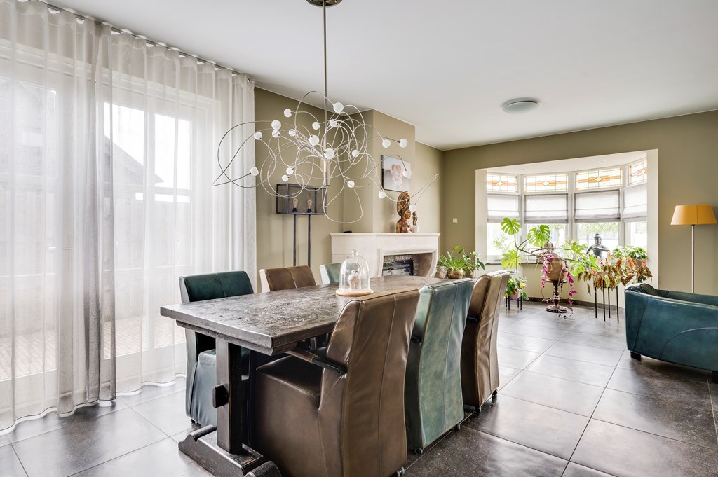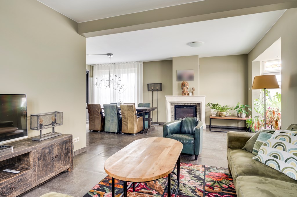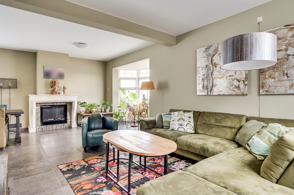 Sfeervolle living met smaakvolle tegelvloer, erker aan de voorzijde voorzien van glas-in- lood ramen, openslaande deuren naar de tuin en zandstenen schouw met sierhaard.