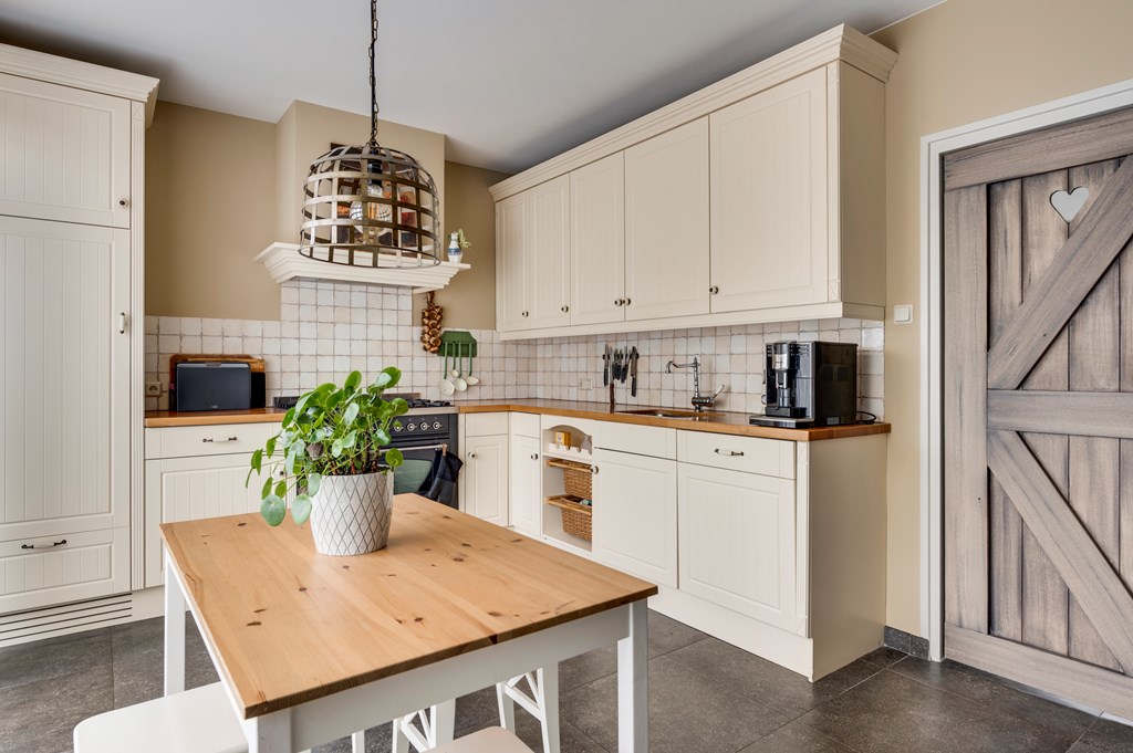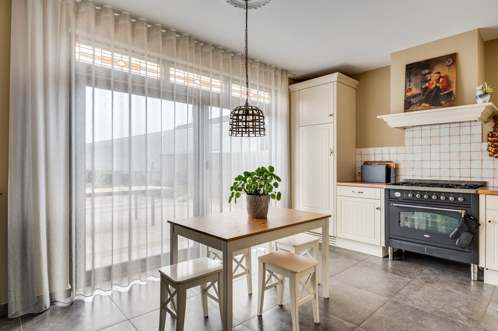 Separate zitkeuken met fraaie en moderne tegelvloer en schuifpui welke toegang biedt naar de tuin. Moderne keukenopstelling compleet met inbouwapparatuur zoals: vaatwasser, koelkast en Boretti fornuis met 5 pits gaskookplaat, grote oven en afzuigkap.