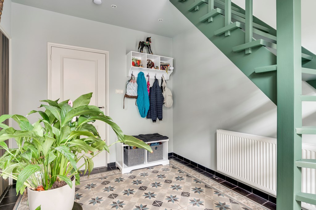 Hal met moderne tegelvloer, meterkast met uitgebreide...
