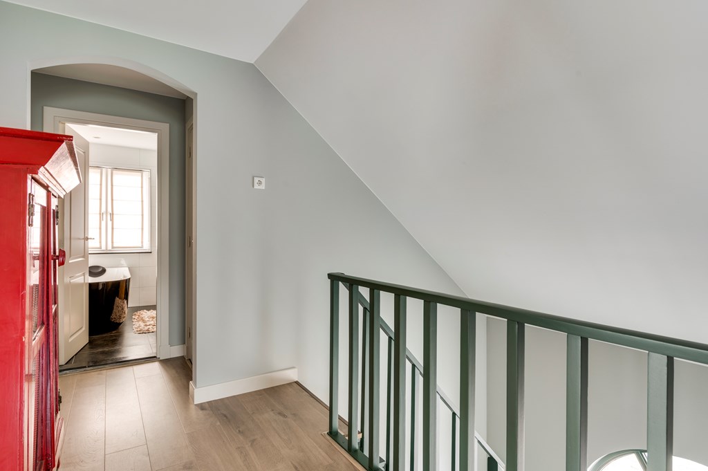 Overloop met laminaatvloer, inbouwspots en vide. Separate moderne toiletruimte (ca. 2020) met zwevend closet.