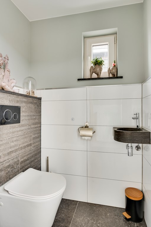 Stijlvol en modern betegeld toilet met zwevend closet, fonteintje en inbouwspots.