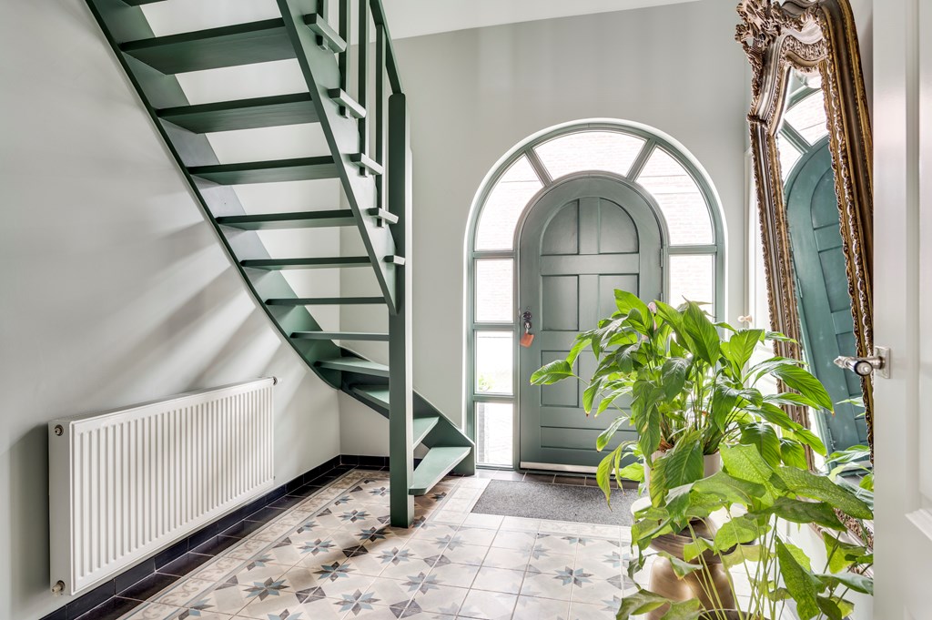 ... en vernieuwde groepenverdeling, trapopgang naar 1e verdieping en loopdeur naar keuken en living.