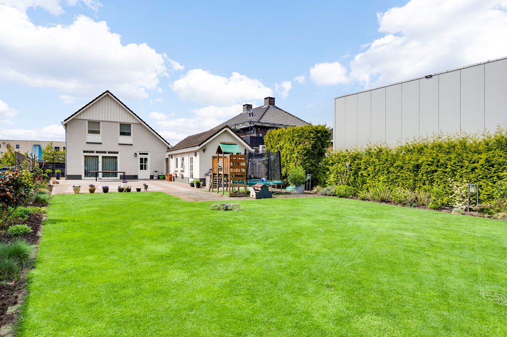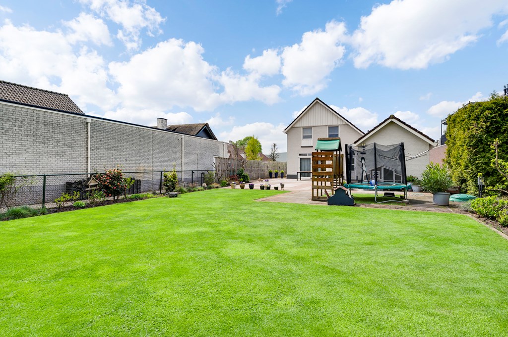 Fraai aangelegde en diepe achtertuin met optimale privacy, sierbestrating, groot gazon, tuinverlichting, stroompunten. Voortuin met grote oprit met plaats voor meerdere auto’s.