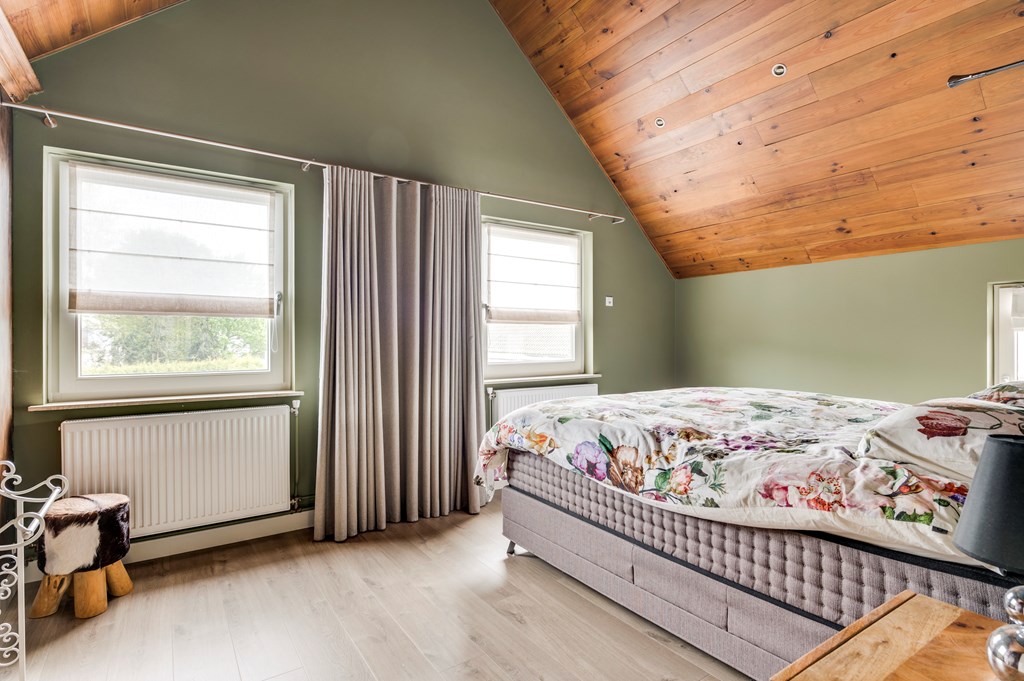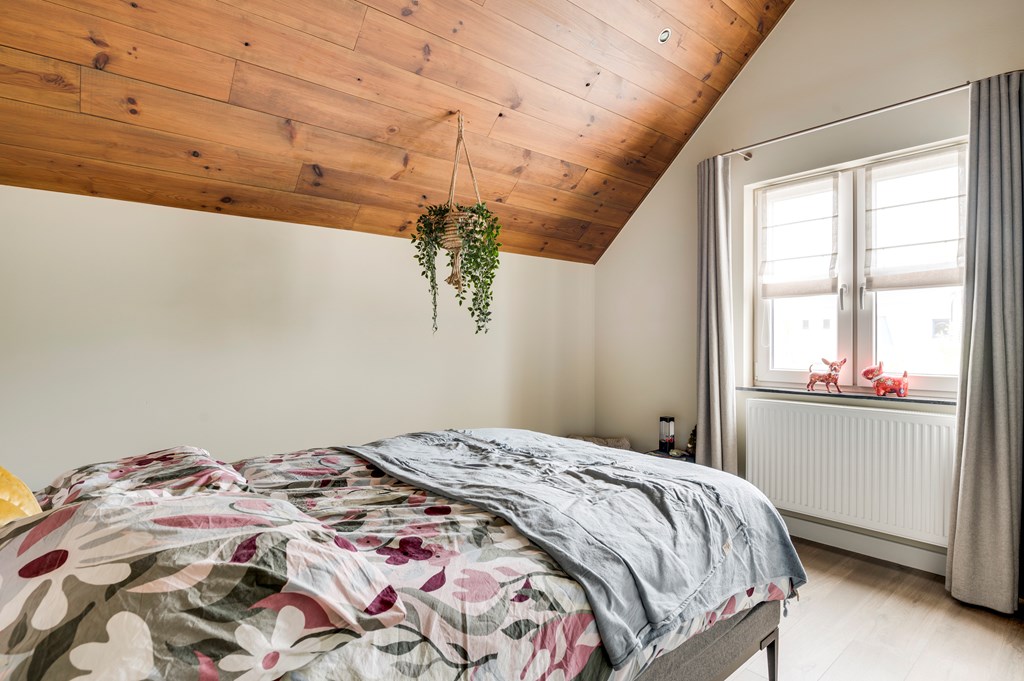 3 Grote slaapkamer met stijlvolle laminaat vloer, hoog plafond tot aan de nok en inbouwspots.
